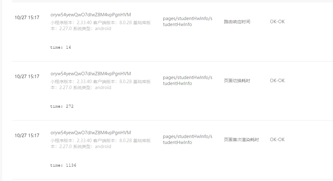我们通过wx.getPerformance监听用的路由切换耗时和页面首次渲染耗时,按照官方给出的页面切换流程来说,路由的切换耗时应该是大于首次渲染耗时的,我在开发者工具和真机调试的时候拿到的数据都是正常的。