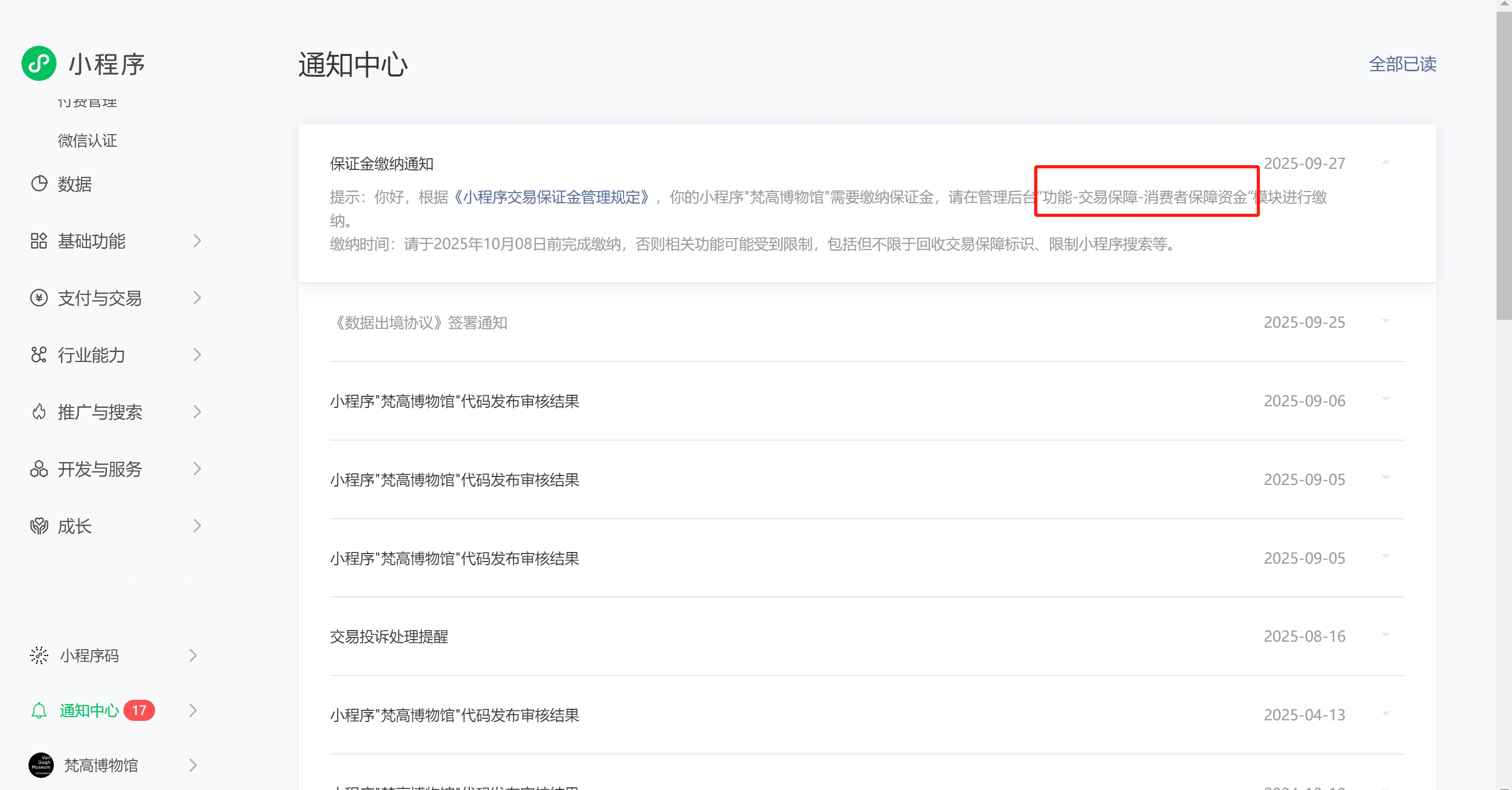 在小程序管理后台https://mp.weixin.qq.com/支付与交易-交易保障-消费者保障资金点击充值缴纳。