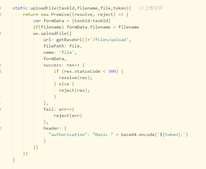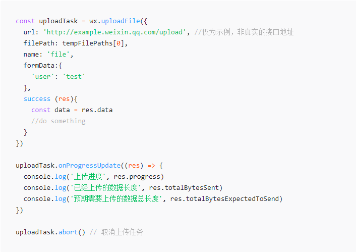const process = {} // 存上传进度 const tasks = {} // 存上传任务 static uploadFile(id, name, path, token){ return new Promise(reslove, reject) { let task = wx.uploadFile({ success (res) { reslove(res) } }) task.onProgressUpdate(res => { process[name] = res // 存起来 console.log('当前任务', name, '的进度是:', res.progress) }) tasks[name] = task // 存起来 } } // 根据 name 查询当前上传的进度 function checkProgress(name) { return process[name] || {} } ========= // 实际上传调用的地方 FileRequest.uploadFile(id, '微盟解决方案.zip').then(res => { console.log('文件:', '微盟解决方案.zip', '上传成功!') }) // 自行根据需要在某个时刻去查询上传进度。 let timer = setInterval(function(){ let progress = checkProgress('微盟解决方案.zip') if(progress.process >= 100) { clearInterval(timer) } }, 1000) // 读取一个任务,查进度。 多次 onProgressUpdate 需要注意是否被覆盖。 tasks['微盟解决方案.zip'].onProgressUpdate(res => { console.log('当前任务', name, '的进度是:', res.progress) })这里是我的调用,我想onProgressUpdate知道上传的进度