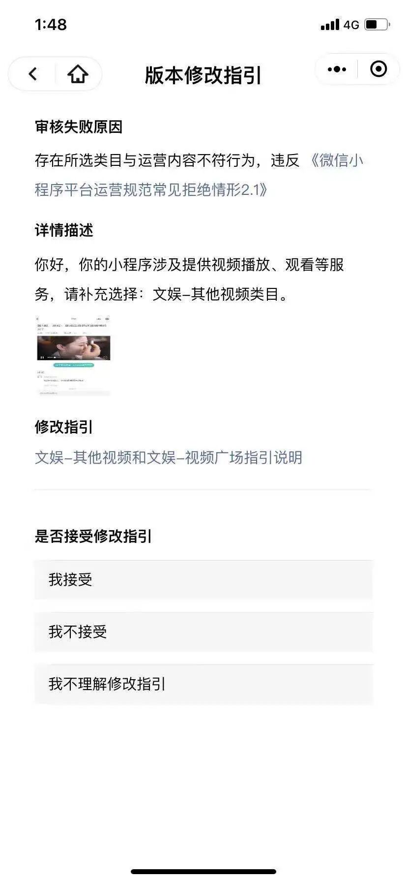 最近一次审核被拒,提示添加“文娱-其他视频”类目,如图所示: