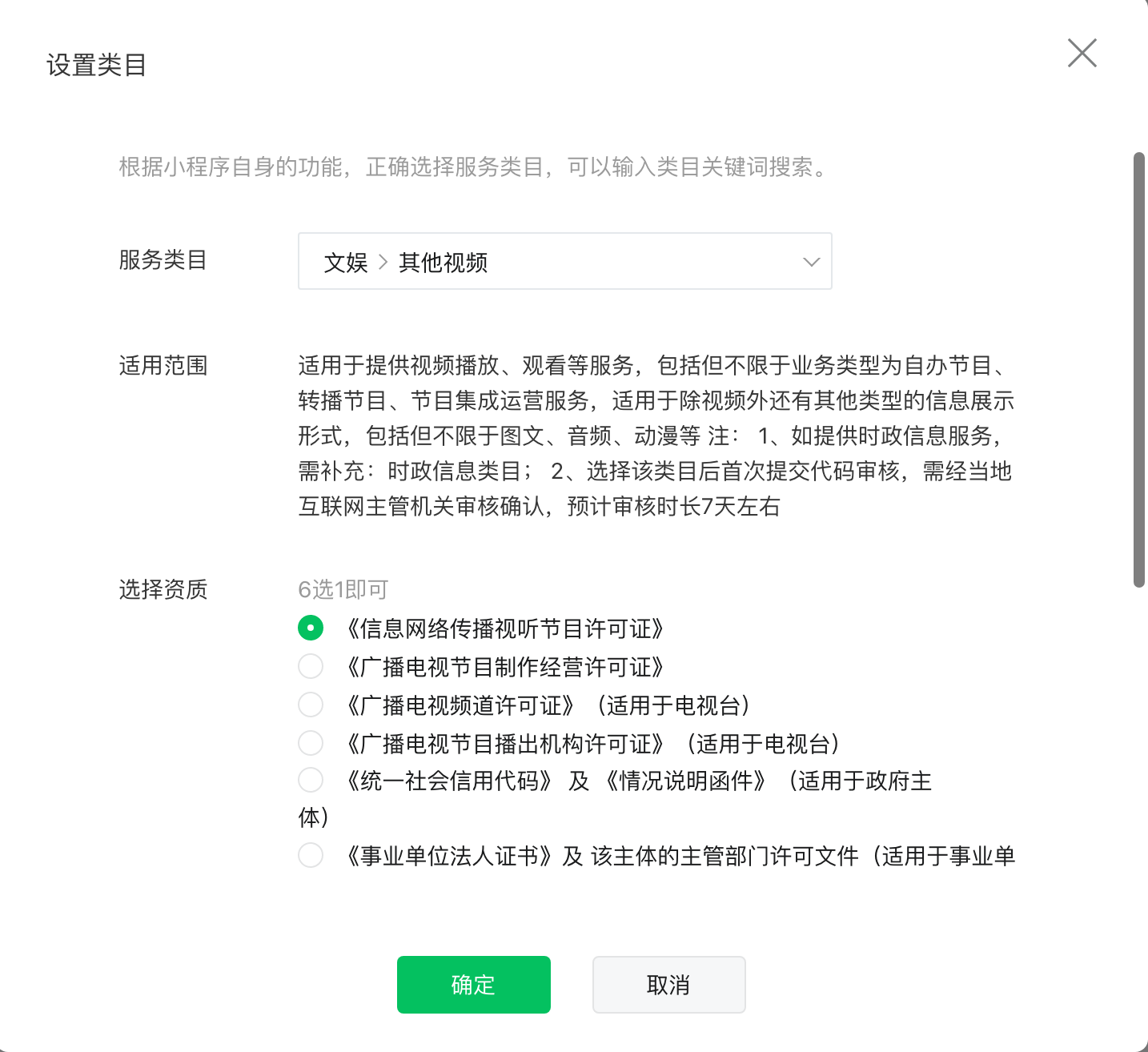使用“腾讯视频”插件播放视频是否可以不设置“文娱-其他视频”类目从而过审?