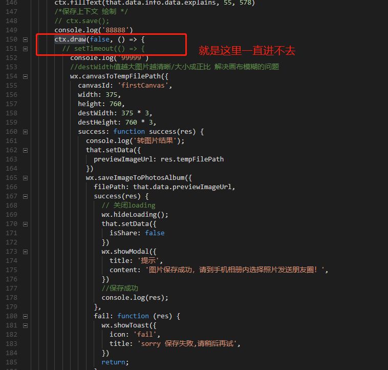 使用小程序的canvas绘图,在绘制图片的这一步卡住了 怎么都进不去ctx.draw这个方法
