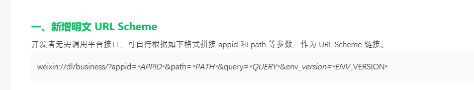 开发者无需调用平台接口,可自行根据如下格式拼接 appid 和 path 等参数,作为 URL Scheme 链接。