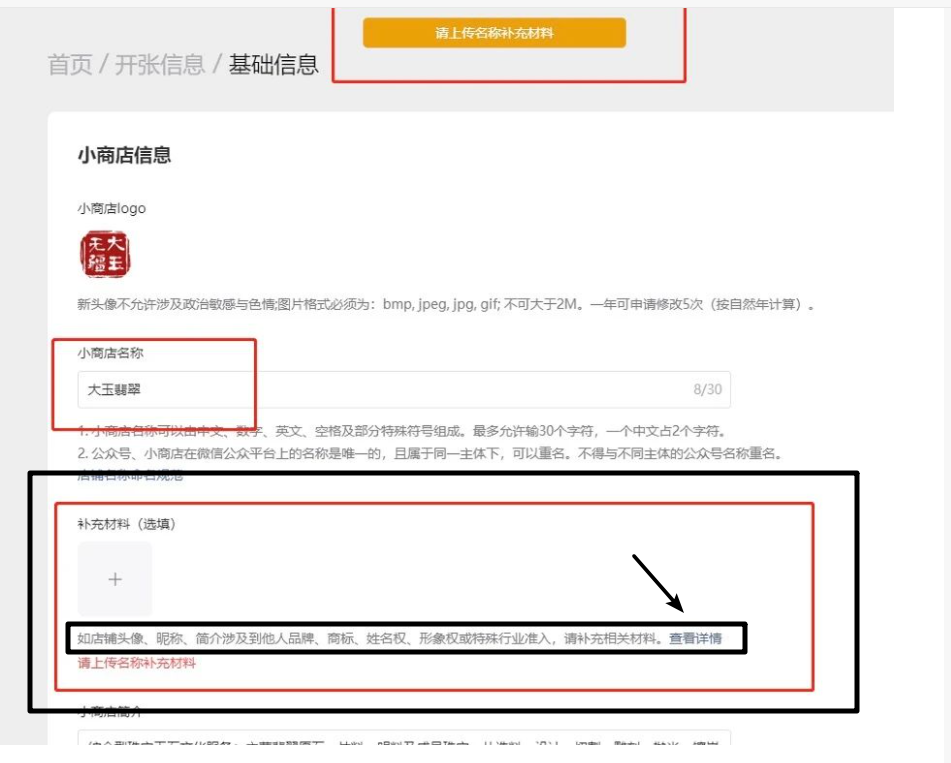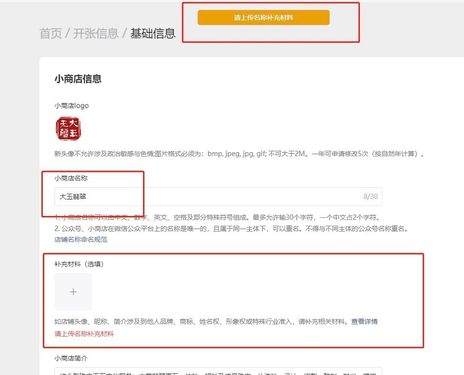 操作开店的过程中的步骤三需要填写基础信息,因为我这边小程序跟小店铺名称重复无法使用,后更改名称提示需要上传补充材料请问补充材料具体指的是什么?