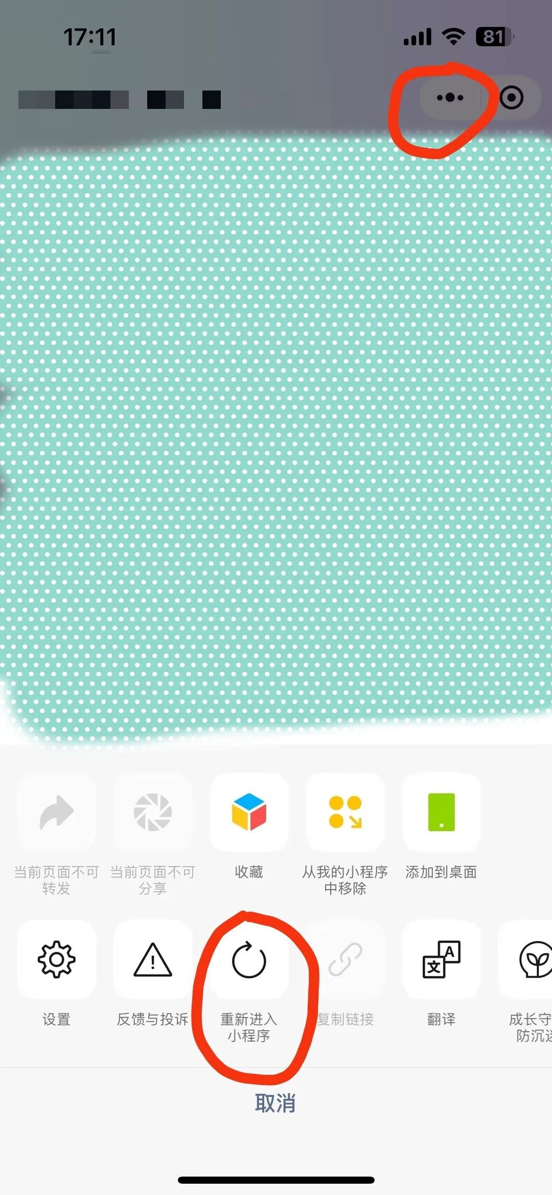 - 用户手动点击右上角胶囊——点击重新进入小程序。