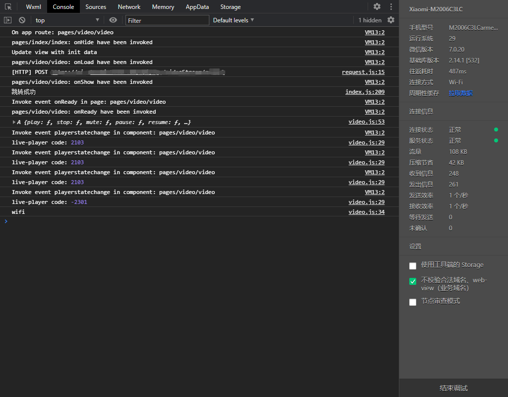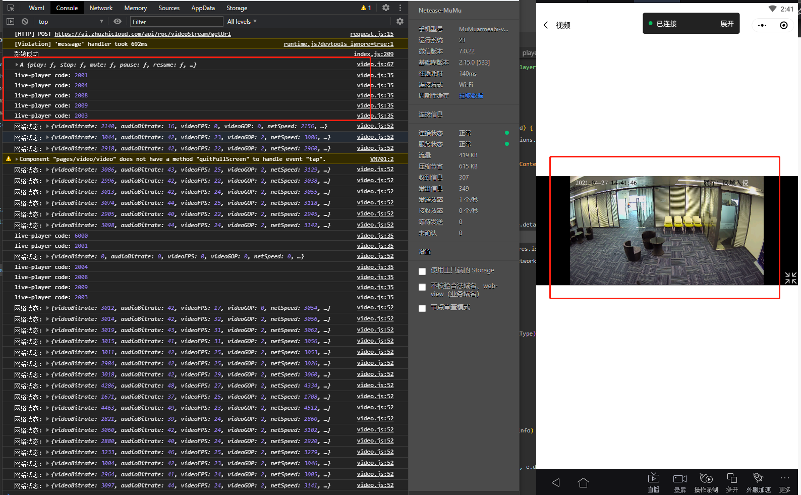 图中的live-player组件在获取到url后,就开始了正常播放,所以现在问题来了,这里到底是设备方推流的时候,视频流没有被解析到,还是,小程序内部调用的安卓视频编码解析器没有正常工作的问题??