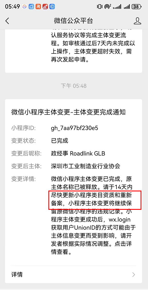 微信小程序主体变更完成后,管理员收到系统提示“请于14天内尽快更新小程序类目资质和重新备案”,具体是在哪里操作呢?