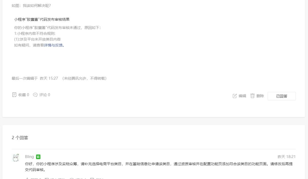 然后官方就又给出不通过给打回来了,并且给了我一个莫名的理由,我便在论坛提问。得到的答案如下。