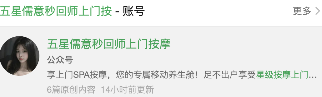 账号昵称:五星儒意秒回师上门按摩 APPID:wxaabcdb28db28abda 搜索时间:2026年1月18日