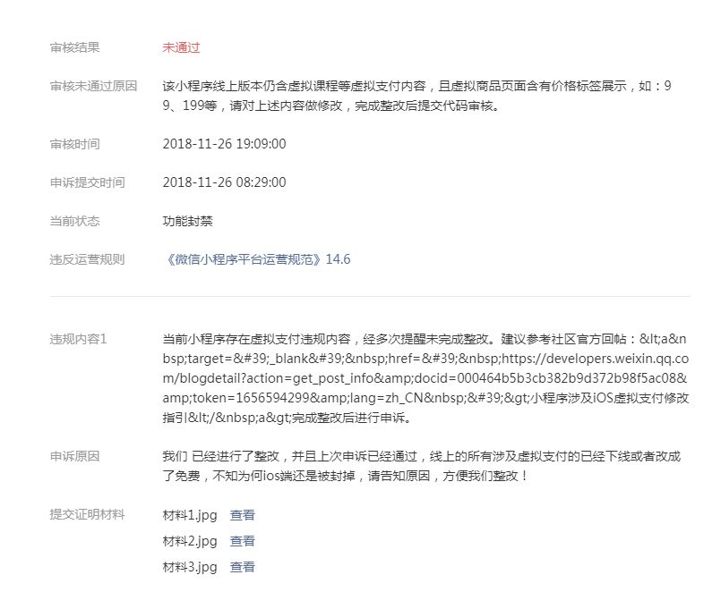 因为有虚拟支付,所以收到了警告,我们进行整改了,并且所有虚拟支付都改为了免费,但是还是被封禁了。所以我在申诉入口那提交了申诉问什么原因被封禁了(在这把申诉机会浪费了),他们告诉我是有价格字眼,让我们重新提交审核,我们又提交了进行审核,并且通过了。现在ios端还是不能访问,申诉入口也没了,能给解封下吗