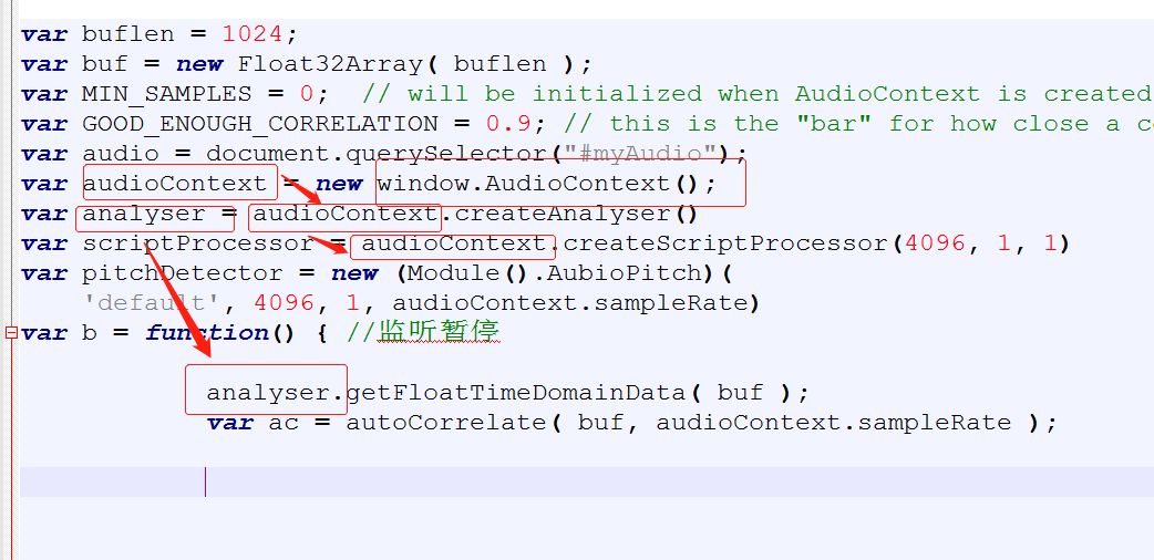 因为要做音频分析可视化相关的功能,需要对播放的音频进行数据分析和处理,需要拿到缓冲区的原始数据,会调用audioContext.createAnalyser(),audioContext.createScriptProcessor()等方法,我看