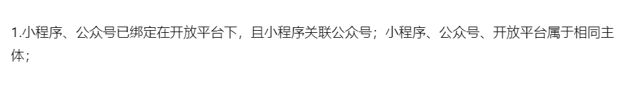 2.小程序、公众号已绑定在开放平台下,且小程序关联公众号;小程序、公众号、开放平台属于相同主体;