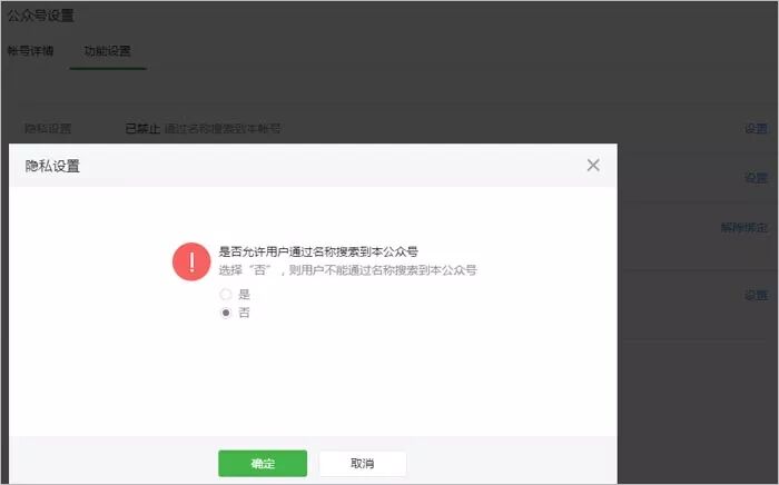 微信公众号账号昵称无法被搜索到,确认过微信公众微信平台->设置->帐号信息->隐私设置没有设置了禁止被搜索