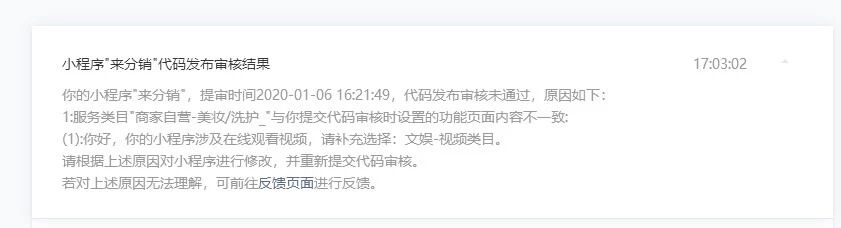 你好,经核实,你的小程序确实含视频内容,建议自查代码,确保包括前端展示、小程序代码等整体均移除:相关内容,再提交代码审核。(详图如下)