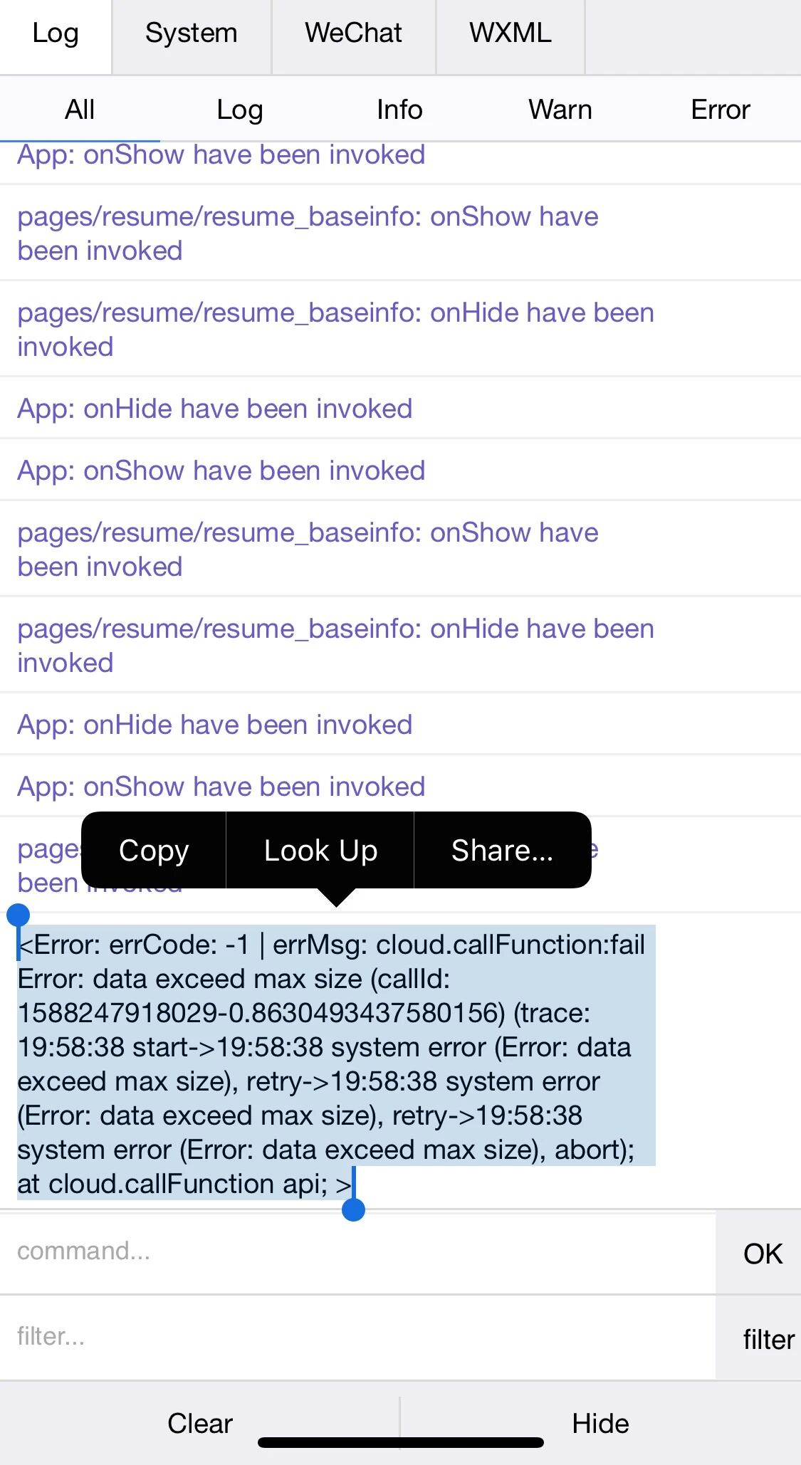 Error: errCode: -1 | errMsg: cloud.callFunction:fail Error: data exceed max size (callId: 1588248668719-0.3950792483647896) (trace: 20:11:8 start->20:11:15 system error (Error: data exceed max size), retry->20:11:23 system error (Error: data exceed max size), retry->20:11:27 system error (Error: data exceed max size), abort); at cloud.callFunction api;