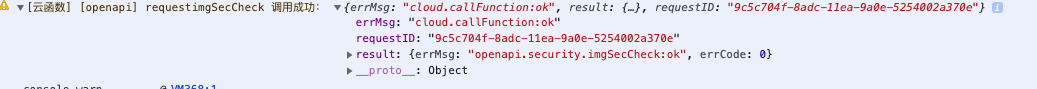 - [云函数] [openapi] requestimgSecCheck 调用成功: {errMsg: "cloud.callFunction:ok", result: {…}, requestID: "9c5c704f-8adc-11ea-9a0e-5254002a370e"}