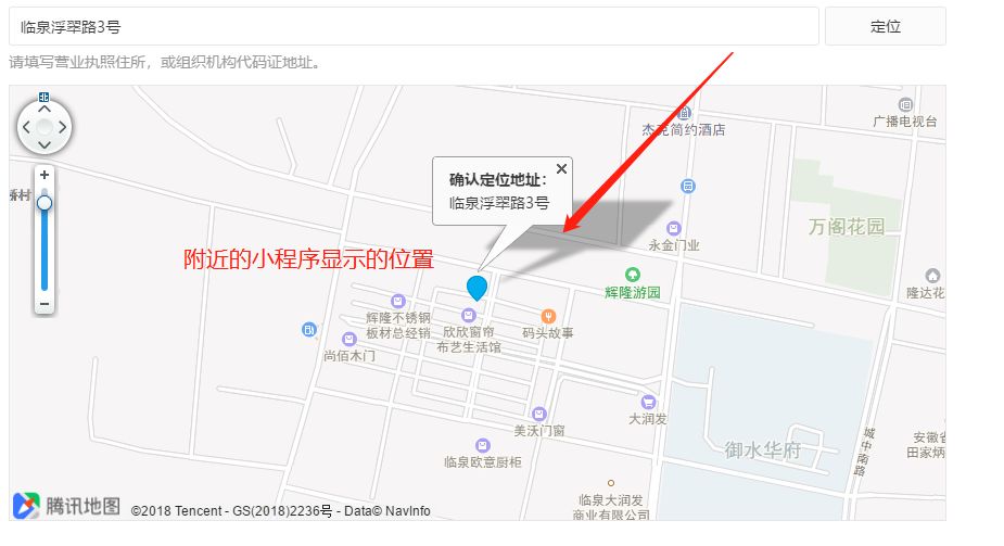 这个是小程序附近的地理位置,(临泉县浮翠路3号)标在了辉隆游园这个地方!