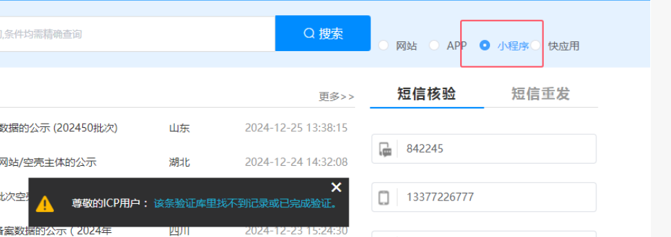 小程序后台有发需要备案短信核验的站内信通知吗;