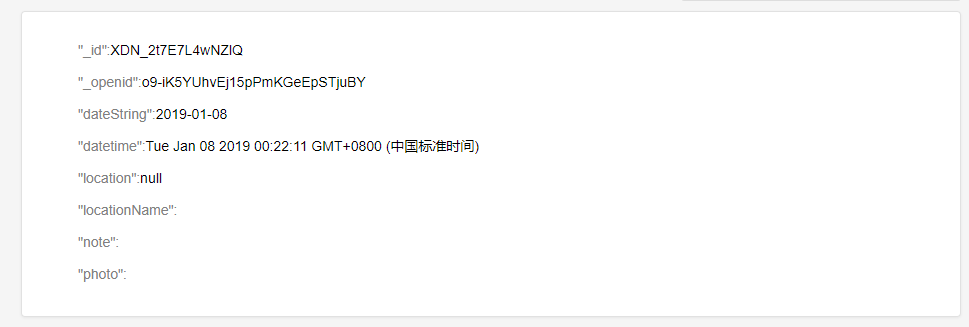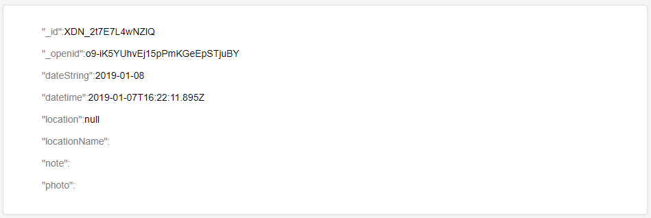 const data = { data: { datetime: datetime, dateString: dateString, note: note, photo: photo, location: locationName ? db.Geo.Point(longitude, latitude) : null, locationName: locationName } }; return getRecords({ dateString }) .then(result => { if (result.length > 0) { return records.doc(result[0]['_id']).set(data); } else { return records.add(data); } }); |