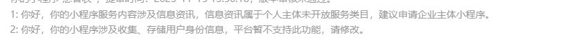 你好,经核实,小程序服务内容涉及信息资讯,信息资讯属于个人主体未开放服务类目,建议申请企业主体小程序或移除整体上述内容,再提交代码~