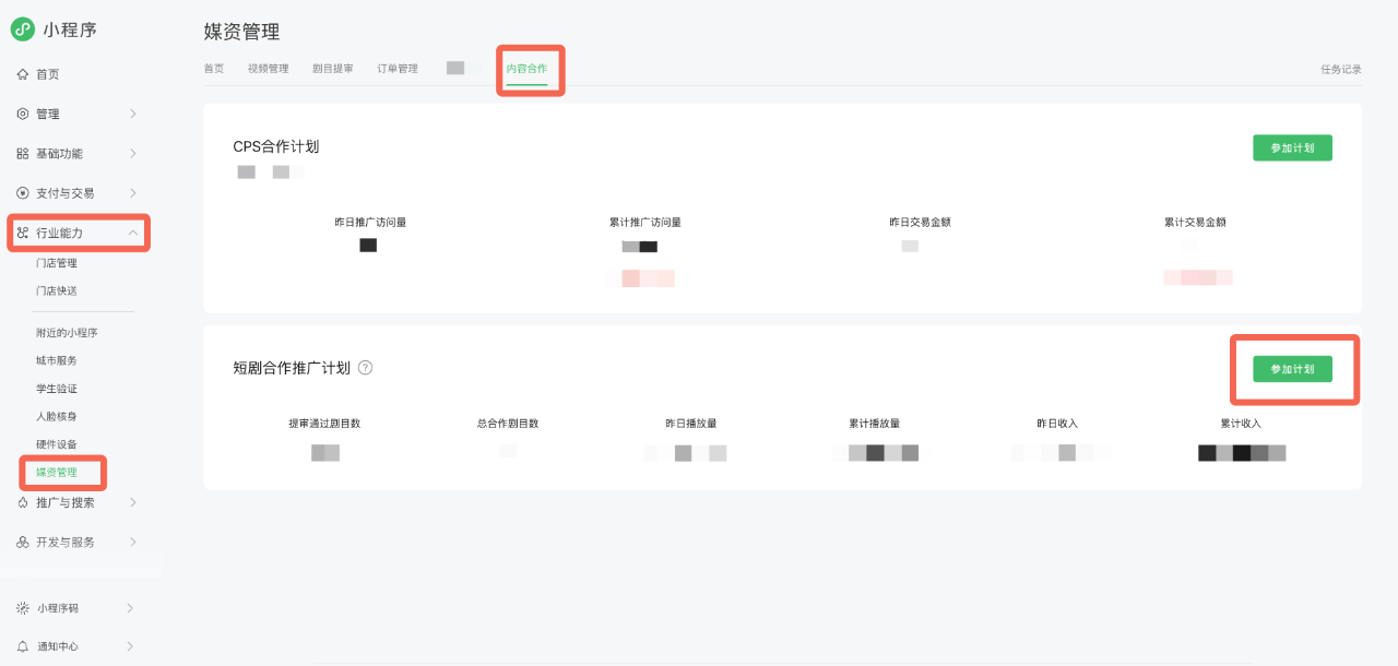 - 小程序后台:「媒资管理」-「内容合作」-「短剧合作推广计划」-「参加计划」