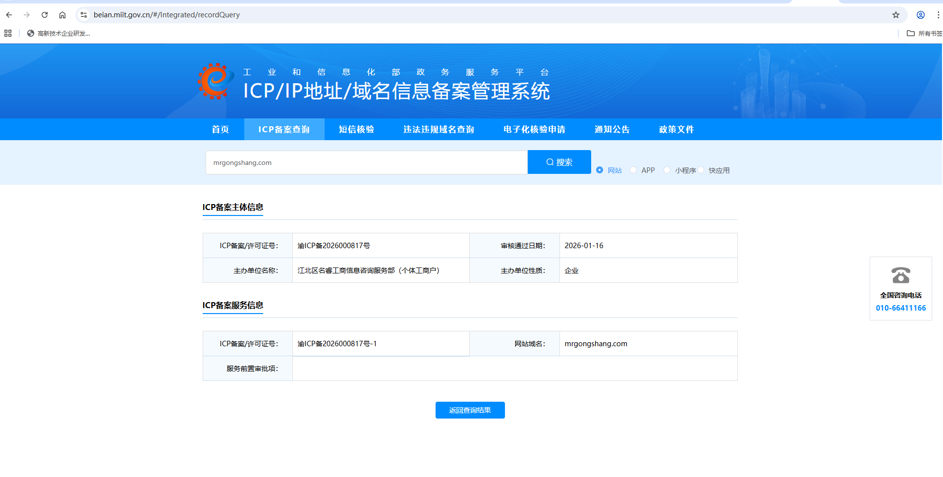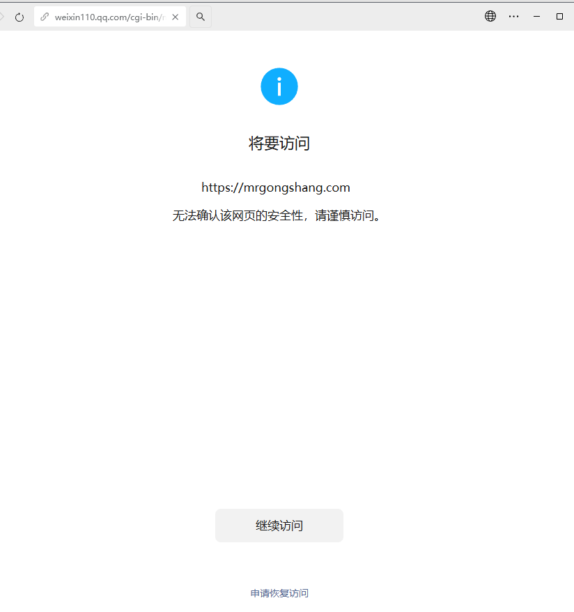 您好,我的域名链接https://mrgongshang.com在微信里面打开提示“无法确认该网页的安全性,请谨慎访问。”,域名才刚刚icp备案好,没有违规,请核查解除限制,谢谢