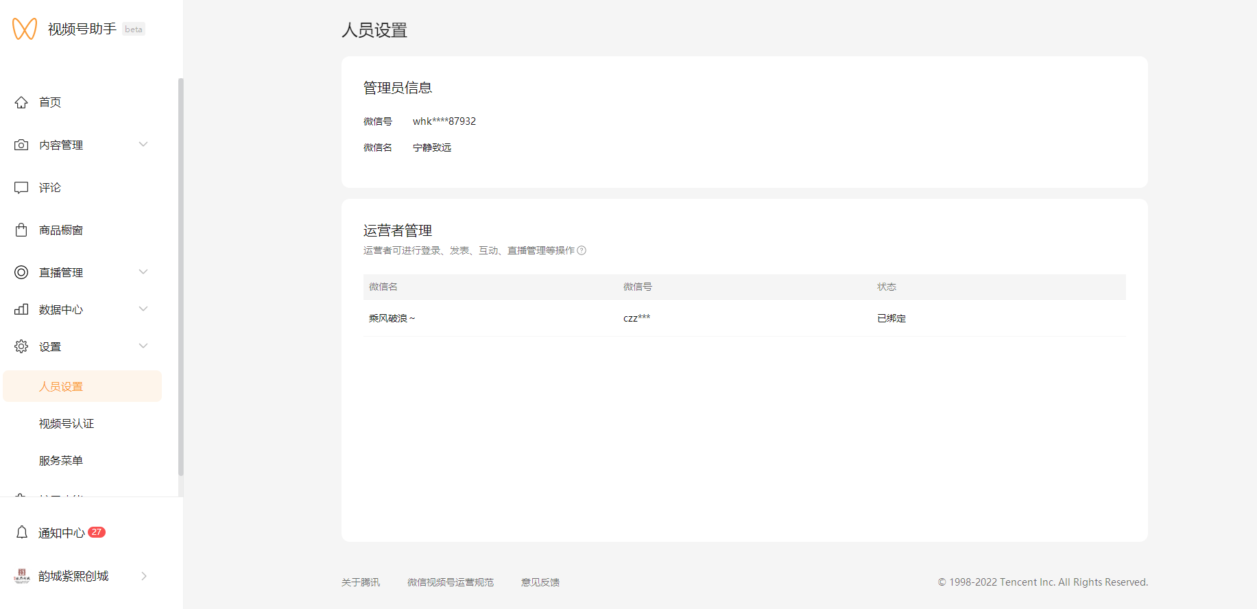 请使用视频号管理员帐号登录视频号助手(https://channels.weixin.qq.com/platform),在左侧页面设置>人员管理内,操作绑定运营者。