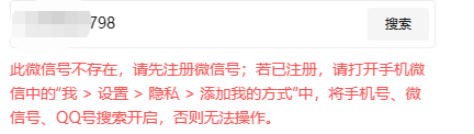 对于提示微信号不存在的情况,我的情况是使用chrome浏览器操作不行;不断更换,最后成功条件为:Edge浏览器,填写微信号(不是手机号)并搜索,成功;