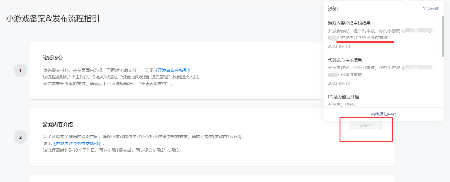 小游戏代码审核已经通过,发布时提示需要提交备案信息,提交备案信息又需要等待1资质提交,2游戏内容介绍审核通过后才能提交;消息中心已经提示内容介绍审核已通过,但是下方状态从18号收到消息后开始一直显示审核中,也无法操作。备案无法提交,代码通过了也没办法发布上线;
