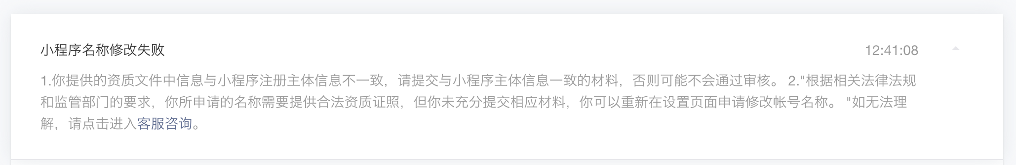 通知中心有一条这个消息,然后按着提示去修改,但去到设置页面,还显示审核中,怎么处理呢?