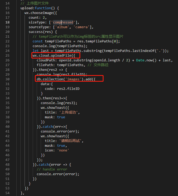 这里存入数据库啊,这里是可以获取res.fileID的呀,你上面都写了这个获取id了,赋值给 app.globalData.fileID
