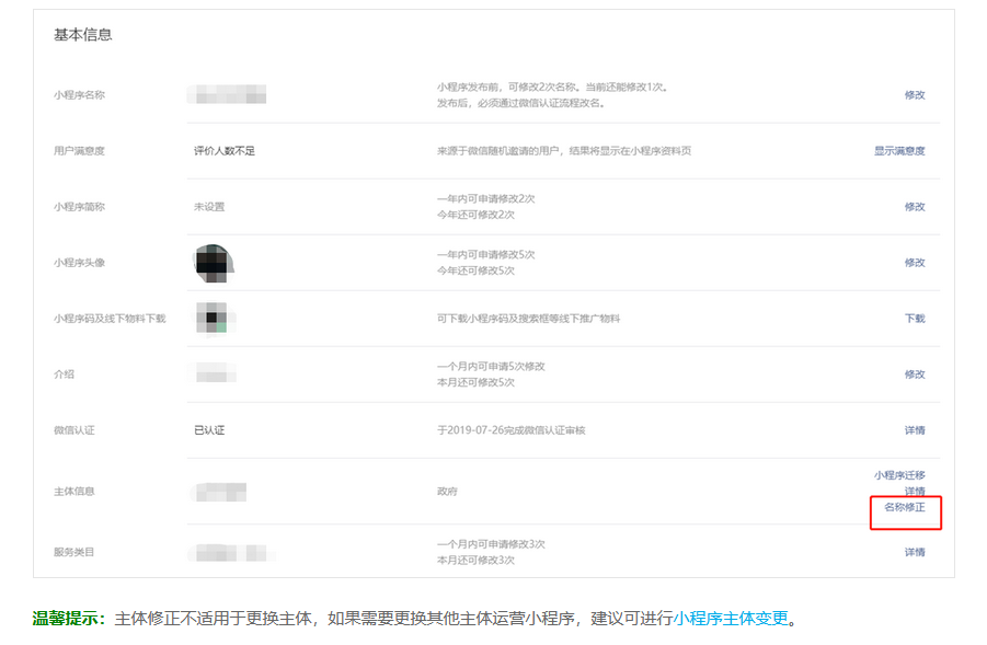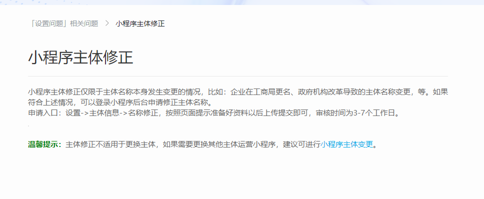 小程序主体修正仅限于主体名称本身发生变更的情况,比如:企业在工商局更名、政府机构改革导致的主体名称变更,等。如果符合上述情况,可以登录小程序后台申请修正主体名称。
