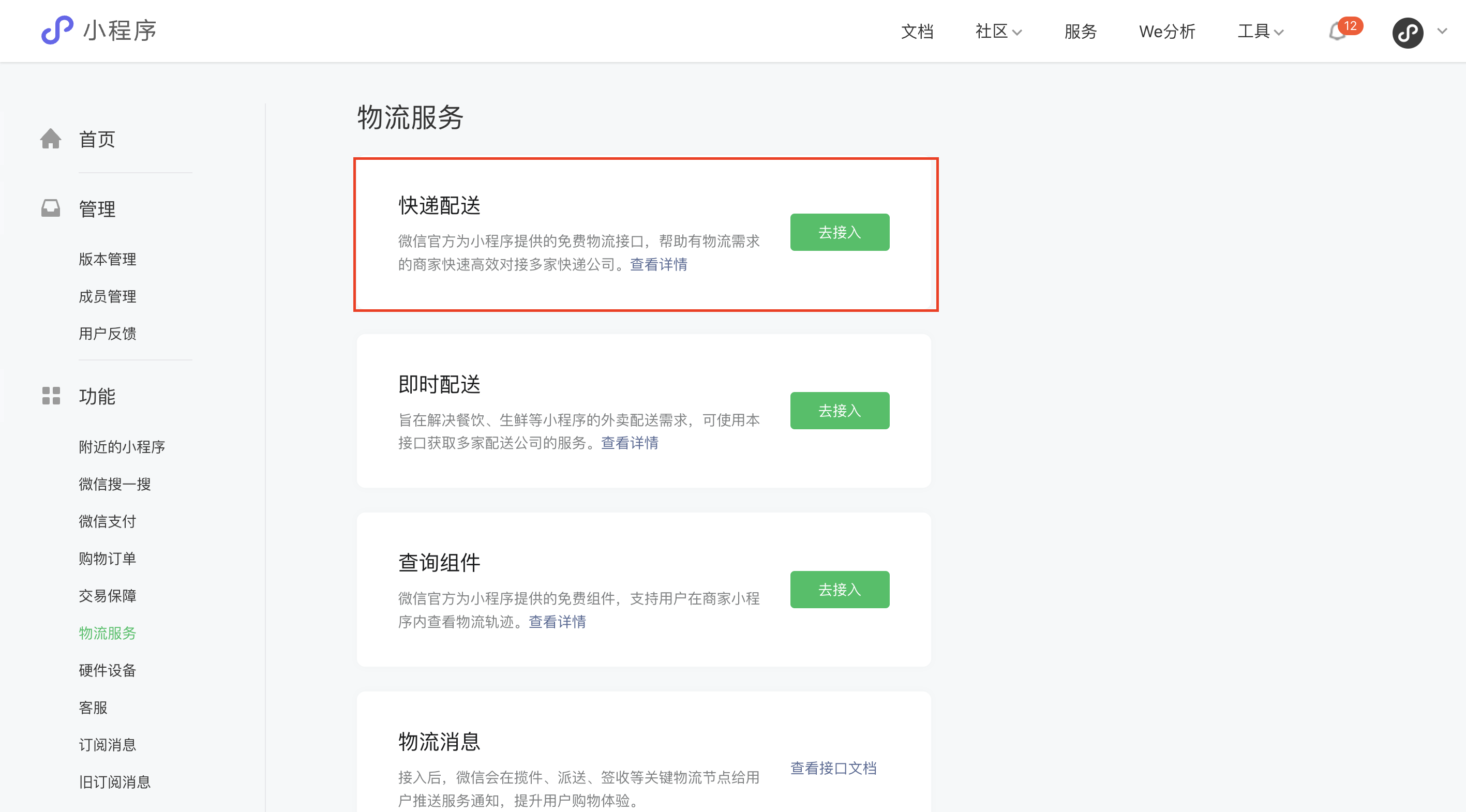 如果是需要接入微信物流助手能力,可以看下这个文档。https://developers.weixin.qq.com/miniprogram/dev/platform-capabilities/industry/express/delivery/logistics-helper.html
