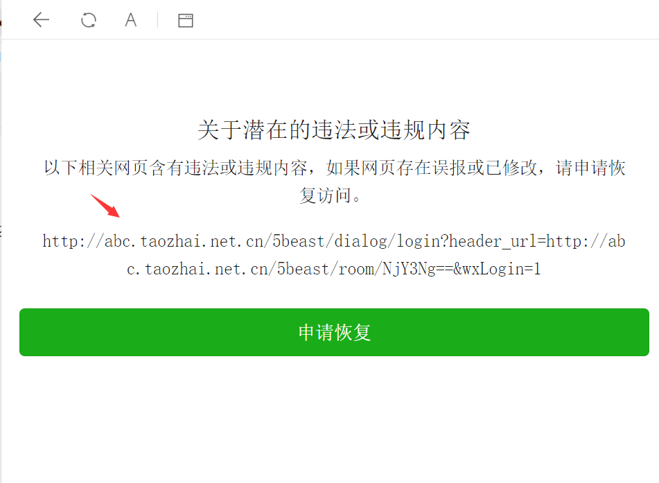去点击“申请恢复访问”,就可以看到系统提示的违规页面了。