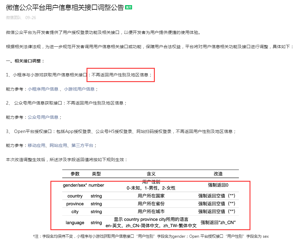 想问一下,这个改造后的接口,是不是userinfo获取不到用户性别和地区呢?