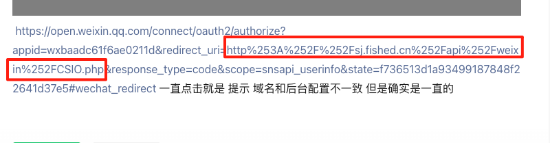 https://open.weixin.qq.com/connect/oauth2/authorize?appid=wxbaadc61f6ae0211d&redirect_uri=http%253A%252F%252Fsj.fished.cn%252Fapi%252Fweixin%252FCSIO.php&response_type=code&scope=snsapi_userinfo&state=f736513d1a93499187848f22641d37e5#wechat_redirect 一直点击就是 提示 域名和后台配置不一致 但是确实是一直的