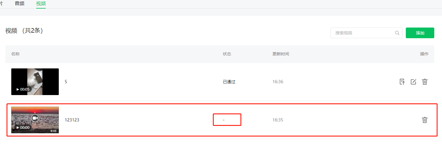 公众号上传永久素材视频素材后,后台看视频的状态是空,点击视频素材提示“审核后才可以播放”,接口有返回mediaId,获取永久素材也可以获取到地址,打开地址只有音频,无视频,并且一直没有状态变化