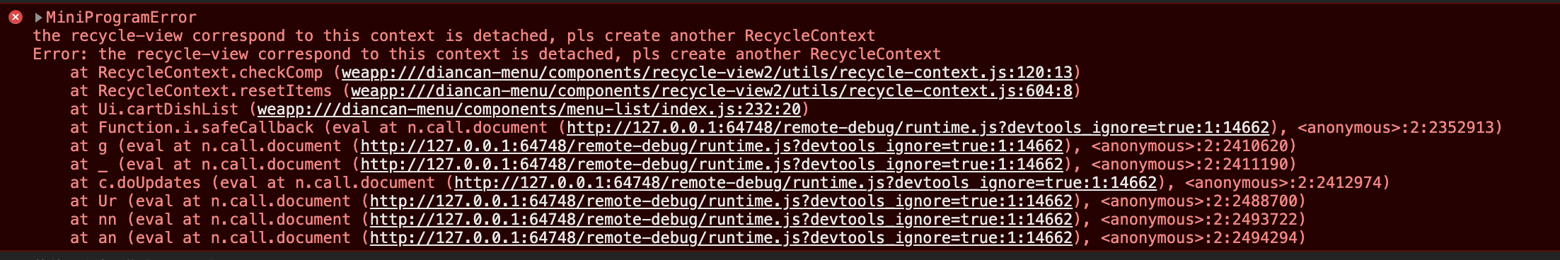 碰到了同样的问题, 扫码预览, 打包都没有问题. 只有真机调试的时候, recycle-view会报错