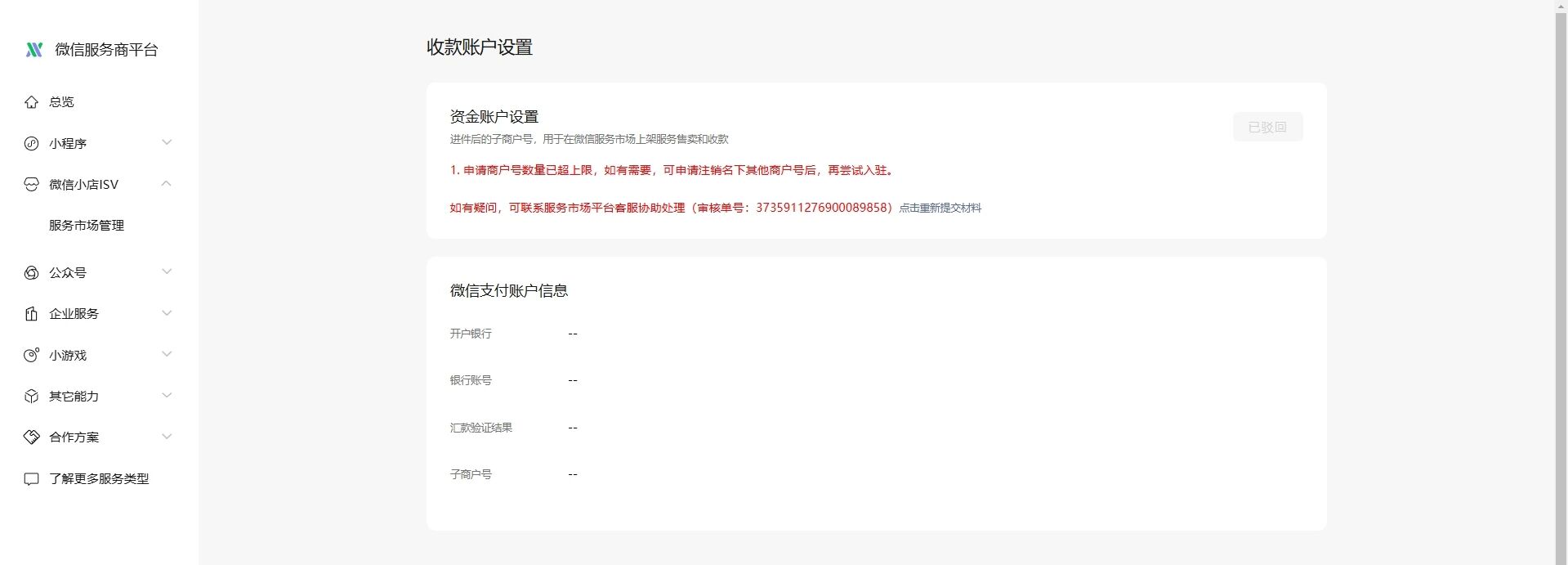 如图,在微信服务商平台申请商户号,提示申请商户号数量已超上限,如有需要,可申请注销名下其他商户号后,再尝试入驻。已注销了几个商户号并重新发起申请,仍然提示相同的原因驳回怎么办?
