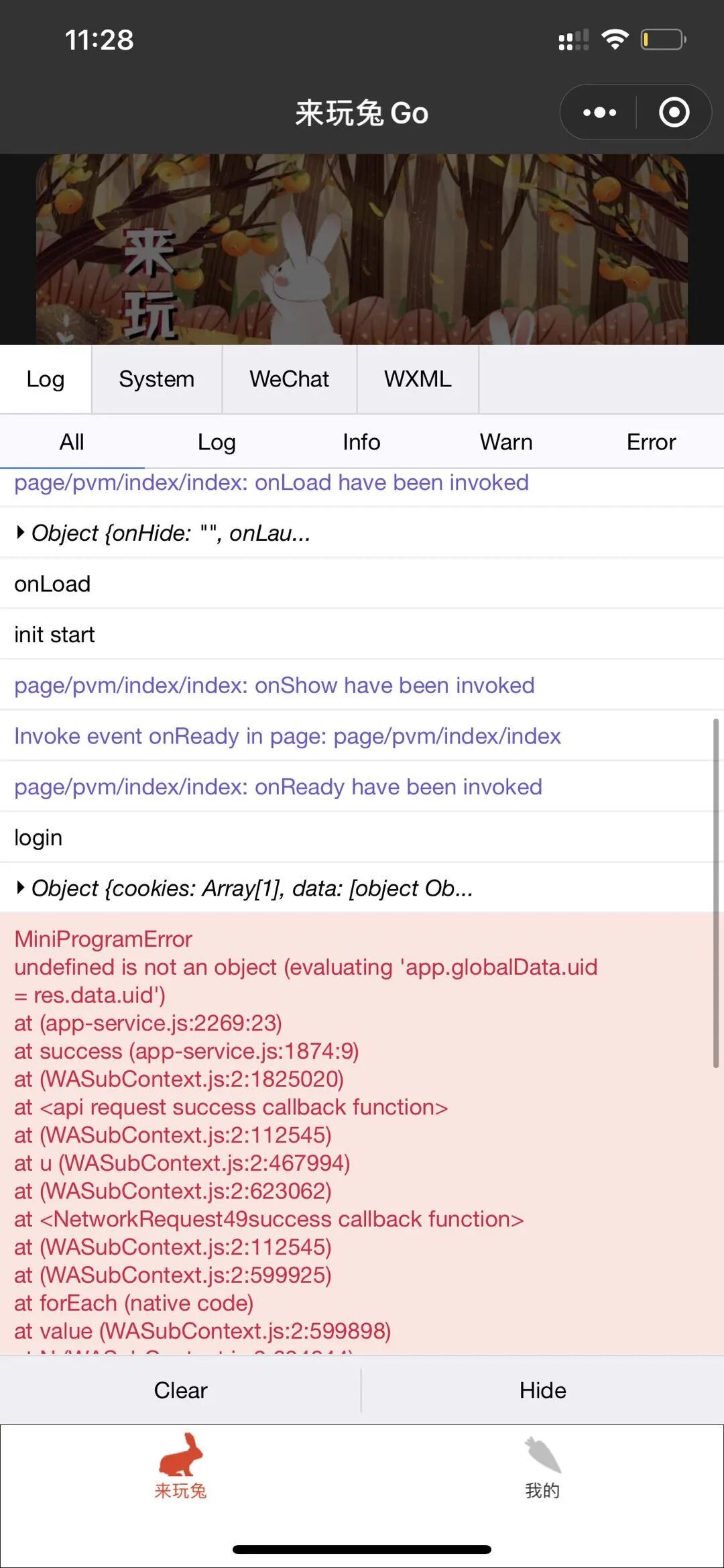 代码内部初步定为点: 使用手机模拟调试时,getAPP() 函数获取失败,但是使用开发工具调试时或者使用开发工具真机模拟的时候都可以用。
