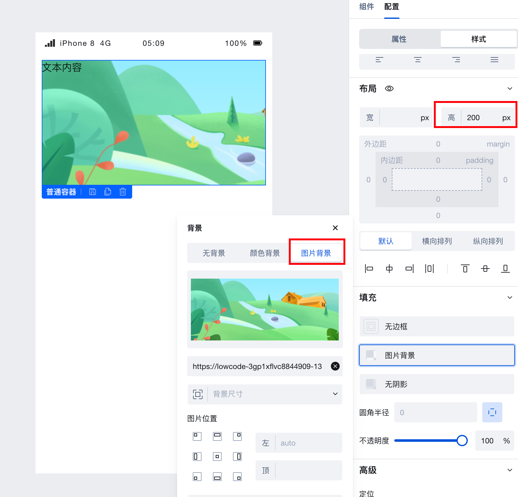 如果您想实现背景图效果,可以直接在最底层的普通容器中设置一个图片背景,以及所需要的高度和宽度,然后在该容器中放入其他组件,如文本按钮等,您看下是否能满足诉求