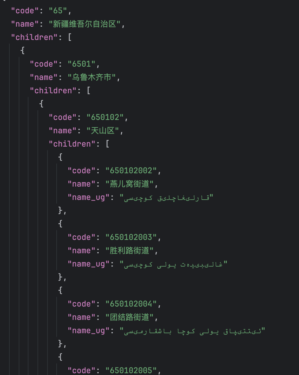 parseAddress(address) { const result = { province: '', city: '', district: '', street: '', address_detail: '', house_number: '' } // 从xinjiang.json读取行政区划数据 const adminData = require('@/static/xinjiang.json') // 省级 if (address.includes(adminData.name)) { result.province = adminData.name address = address.replace(adminData.name, '') } // 地级市或地区 for (const city of adminData.children) { if (address.includes(city.name)) { result.city = city.name address = address.replace(city.name, '') // 县区级 for (const district of city.children) { if (address.includes(district.name)) { result.district = district.name address = address.replace(district.name, '') // 乡镇街道级 if (district.children) { for (const street of district.children) { if (address.includes(street.name)) { result.street = street.name address = address.replace(street.name, '') break } } } break } } break } } // 剩余部分作为详细地址 result.address_detail = address.trim() // 提取门牌号 const numberMatch = result.address_detail.match(/(\d+号|\d+弄|\d+幢|\d+栋)/) if (numberMatch) { result.house_number = numberMatch[1] result.address_detail = result.address_detail.replace(numberMatch[1], '').trim() } return result }就是先得有全国的json:(当然我这个只是新疆的);