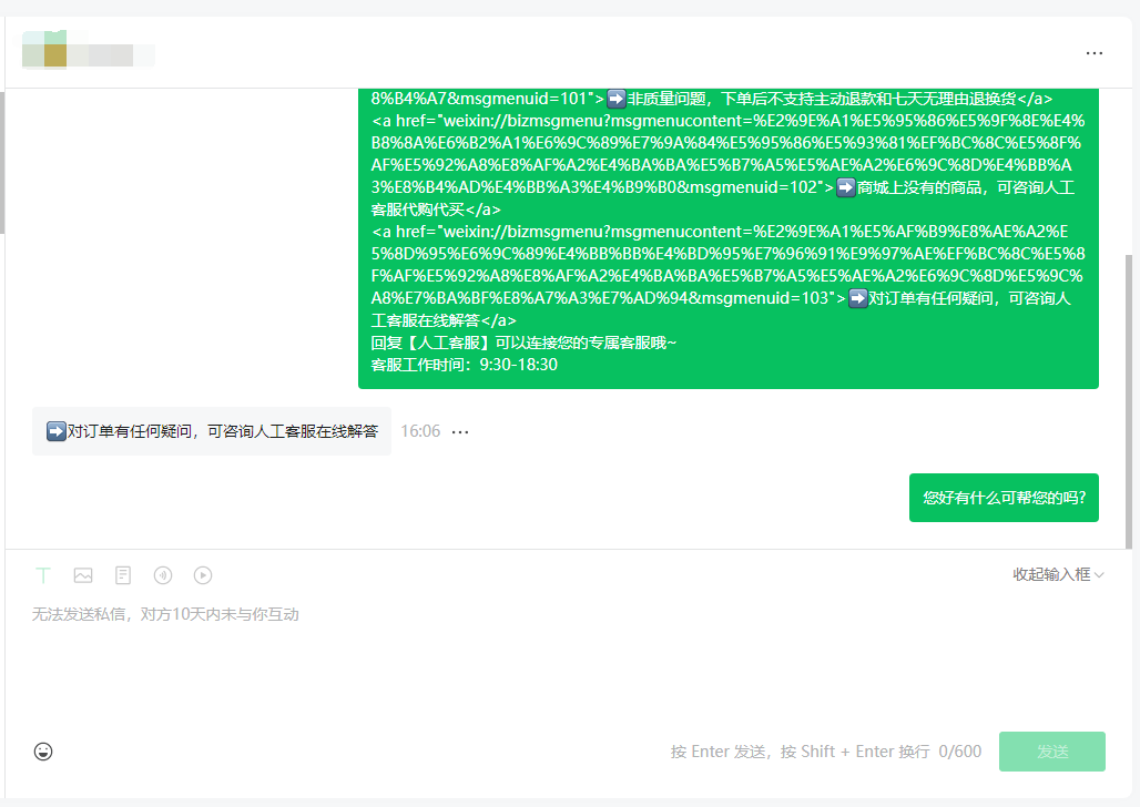 用户新关注的公众号,点击自定义菜单,将信息发送到微信公众平台客服后,我们回复就会出现这样的问题,有时候是48小时内未互动、有时候是10天内未互动这样的问题。