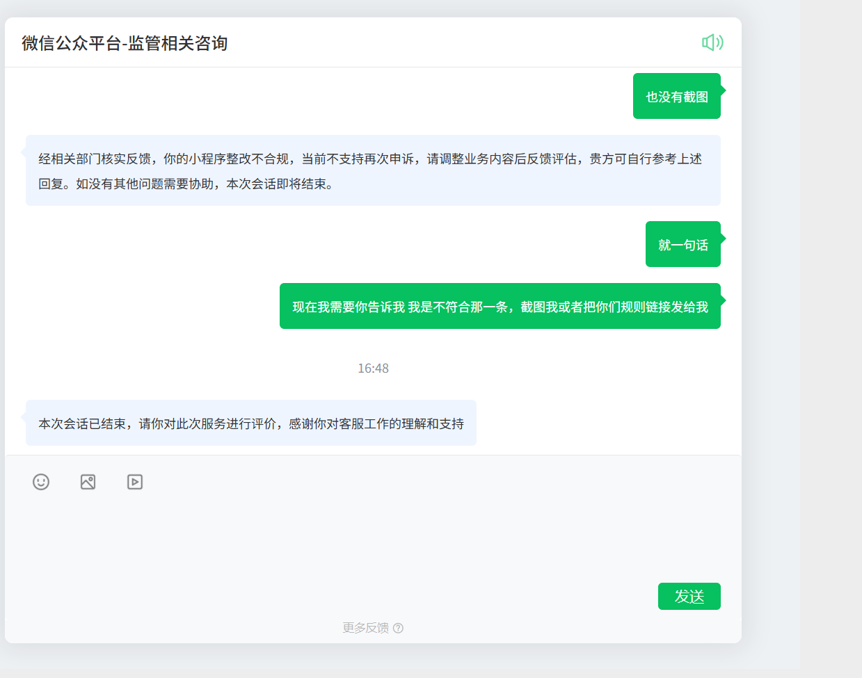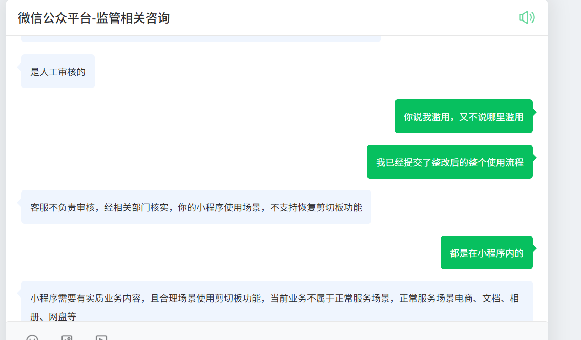 小程序被说滥用剪切板,好的,我们进行整改,然后寻找客服,按照客服指引,修改后完全在小程序内闭环使用,好的,按指引修改好了,然后提交后不通过,再次找客服,然后又变一套说法,说什么剪切板只支持电商,网盘类小程序才支持剪切板,这是什么规则?有没人说一下,按照这个说法,全部小程序都不支持剪切板?那些其他小程序怎么办呢,还直接关闭对话,真的牛批,不解决 直接关闭对话