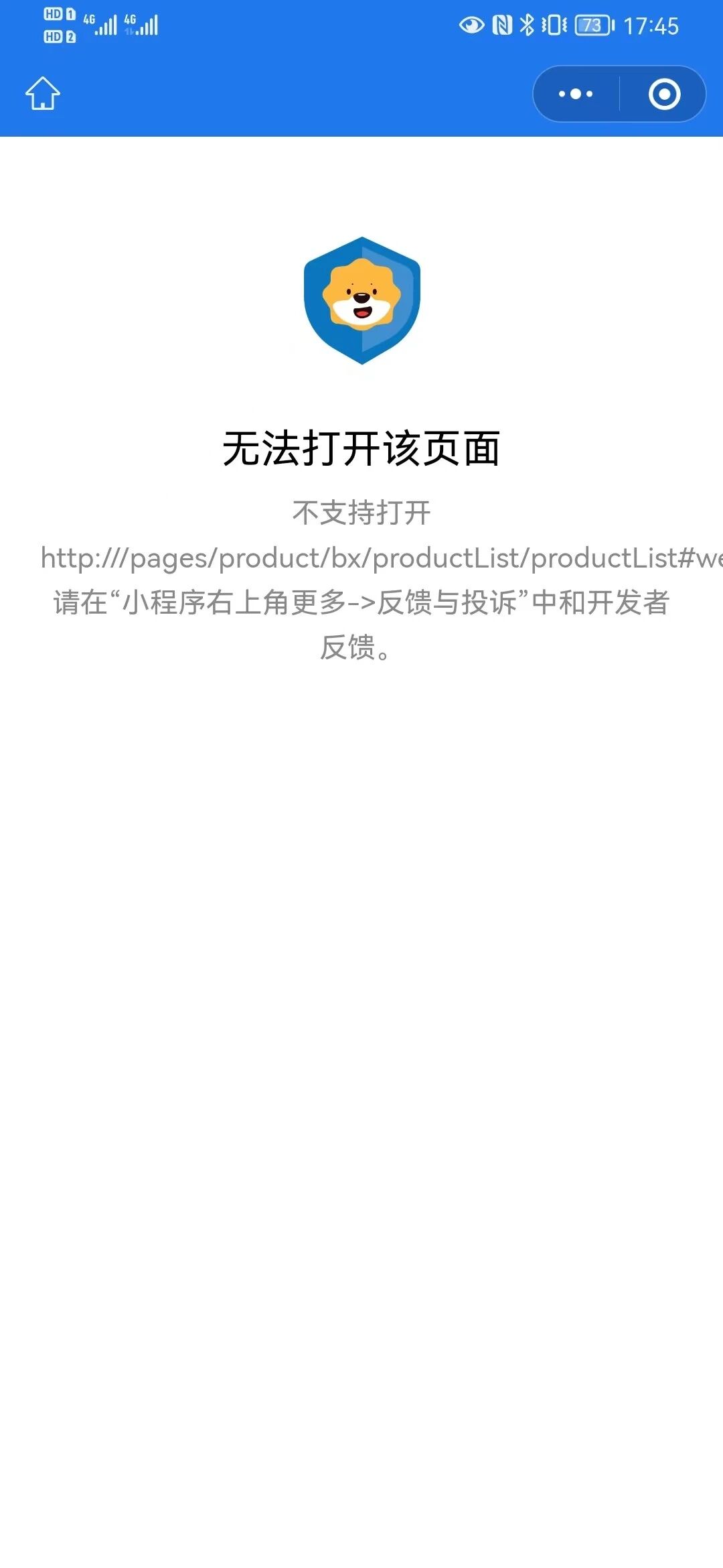 打开小程序页面也报错,上面报错信息是:不支持打开http://pages/product/bx/productList/productList#wechat_redirect,请在“小程序右上角更多->反馈与投诉”中和开发者反馈。