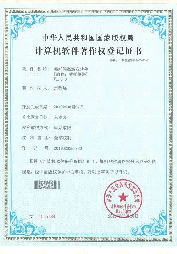 我的小游戏受到了平台的处罚,我申请的软著为 《哪吒闹海游戏软件》,简称:哪吒闹海,如下图所示。