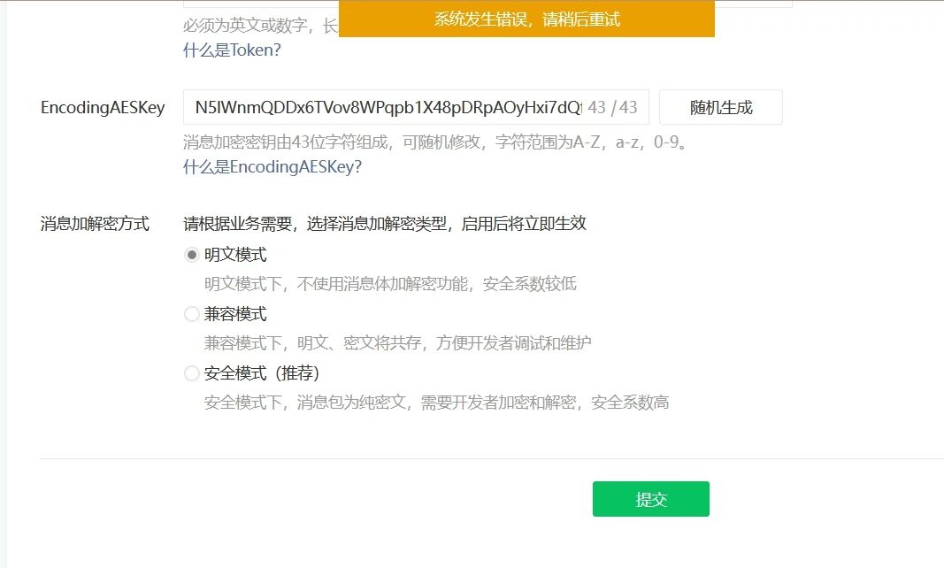你好,详细请参考知识库:https://developers.weixin.qq.com/community/develop/doc/00086e39588df08d45b1c7ef76b009?highLine=%25E5%2585%25AC%25E4%25BC%2597%25E5%258F%25B7%25E6%258F%2590%25E4%25BA%25A4%25E5%259F%25BA%25E6%259C%25AC%25E9%2585%258D%25E7%25BD%25AE%25E6%2597%25B6%25E6%258F%2590%25E7%25A4%25BA%25E7%25B3%25BB%25E7%25BB%259F%25E5%258F%2591%25E7%2594%259F%25E9%2594%2599%25E8%25AF%25AF%25EF%25BC%258C%25E8%25AF%25B7%25E7%25A8%258D%25E5%2590%258E%25E9%2587%258D%25E8%25AF%2595%25E3%2580%2582