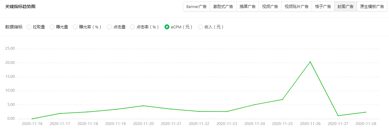 比较差,从上线以来只有大概三次Ecpm超过了5,仅有一次表现的非常好,也可能是我的用户价值比较低,点击率只有1%左右,自从一次爆发之后又回到了Ecpm一两块的水准了