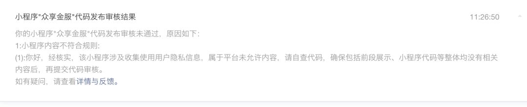 你好,经核实,小程序【开通快捷】页面涉及收集、存储用户身份证信息,平台暂不支持此功能,请自查、处理相关违规内容,确保包括前端展示、小程序代码等整体均没有违规内容。请将相关前端展示、相关代码等均完整去除后,再提交代码审核。