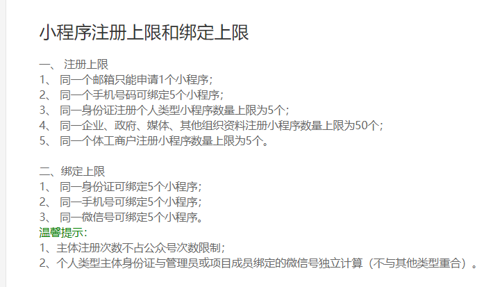 小程序注册上限和绑定上限参考:https://kf.qq.com/faq/170109F3MRFj170109eYJ7fi.html
